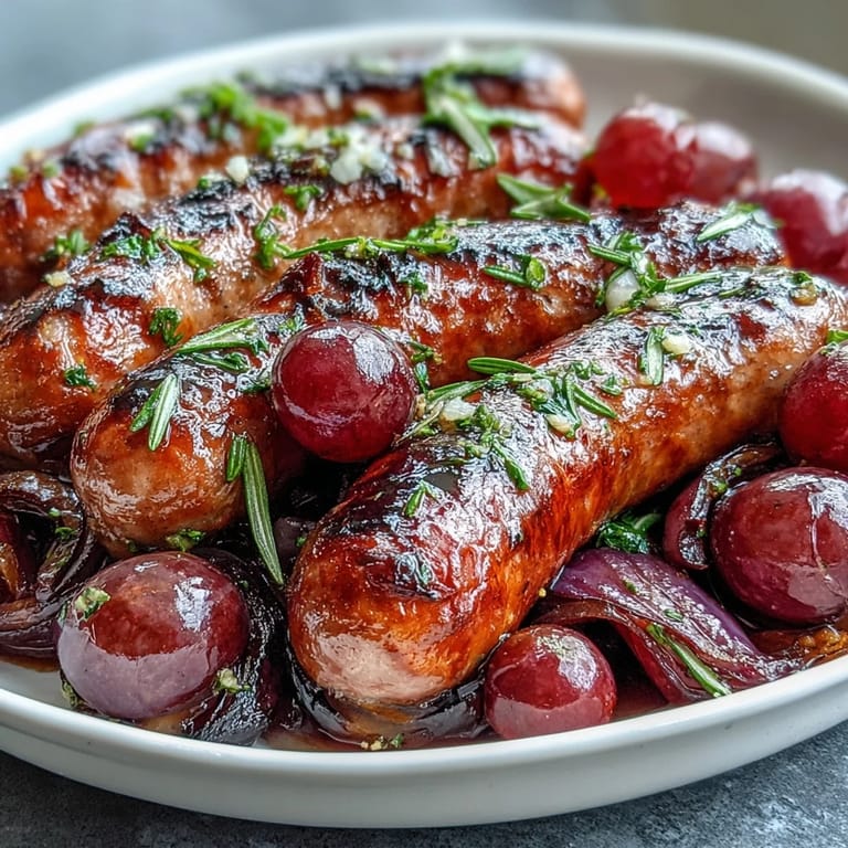 Save My neighbor showed up one evening with a basket of grapes from her overgrown vine and a package of sausages she couldn't use. I had no plan, no recipe open on my phone, just a hunch that heat and time might turn them into something worth eating. What came out of the oven that night—burnished sausages surrounded by sticky, caramelized grapes—became one of those dishes I make when I want to look like I tried harder than I did. It's proven itself at casual dinners and nights when I'm too tired to think, always landing somewhere between impressive and effortless.